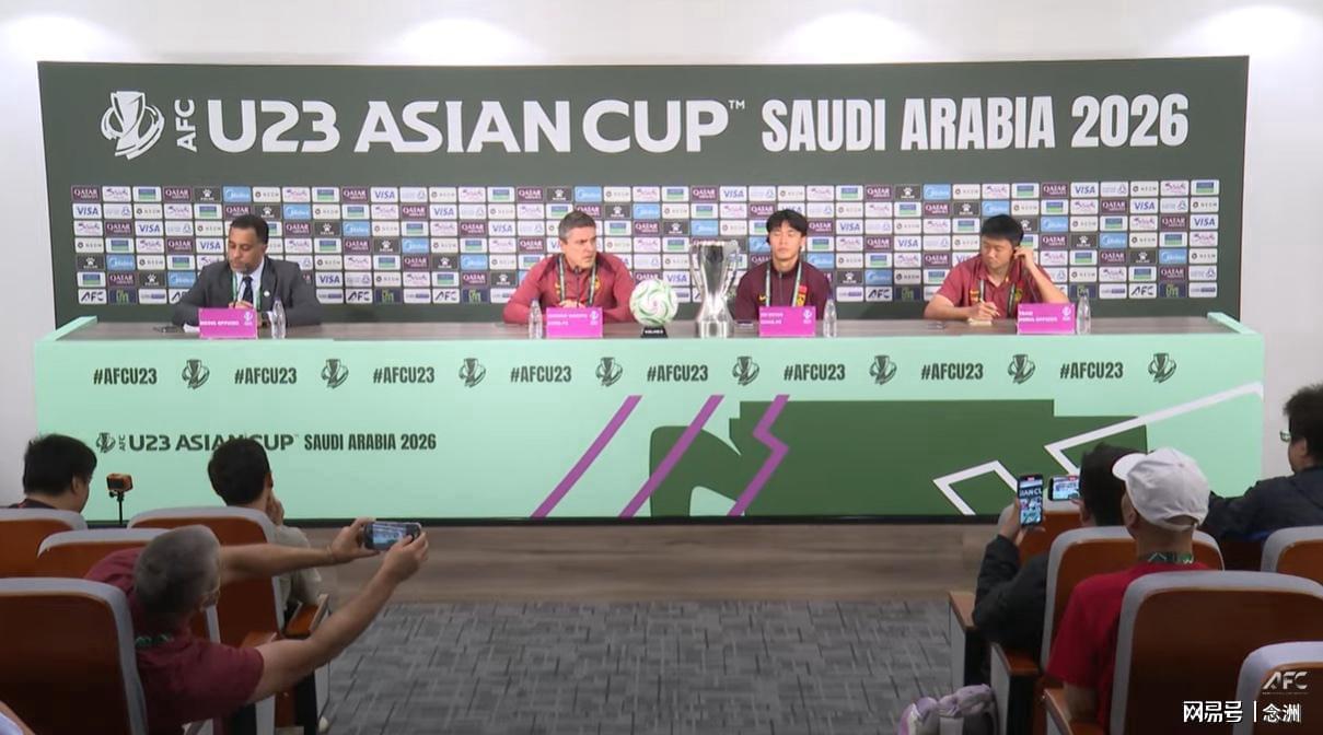 这是U23国足历史上第一次进入亚洲杯决赛。发布会现场,U23亚洲杯冠军奖杯被放在发布会的桌上,安东尼奥和胡荷韬与奖杯合影。